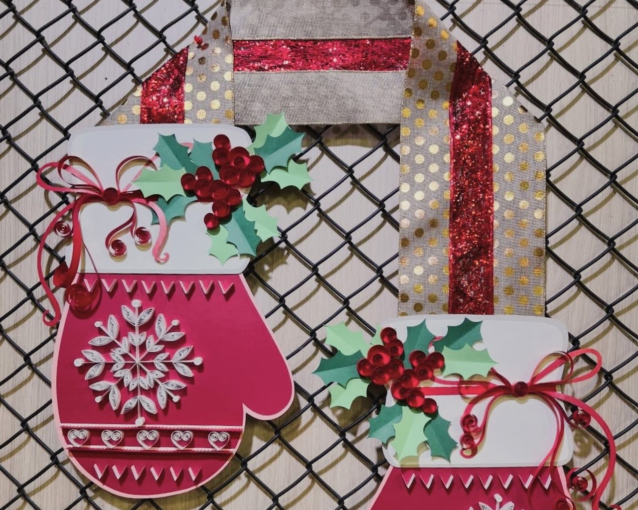 Corte as fitas decorativas em segmentos de 80 cm cada. Una-as com cola quente até obter uma largura de 15 a 20 cm. Fixe essas fitas na parte superior da luva já pronta utilizando cola quente. Em seguida, monte todas as peças de quilling e recortes conforme o desenho do molde, montando a composição da luva, das folhas, dos flocos e do laço.
