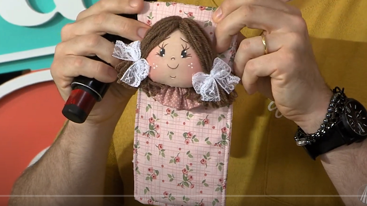 Com a lã faça "marias-chiquinhas" e cole na parte superior da cabeça, coloque os lacinhos de rendinha para decorar.