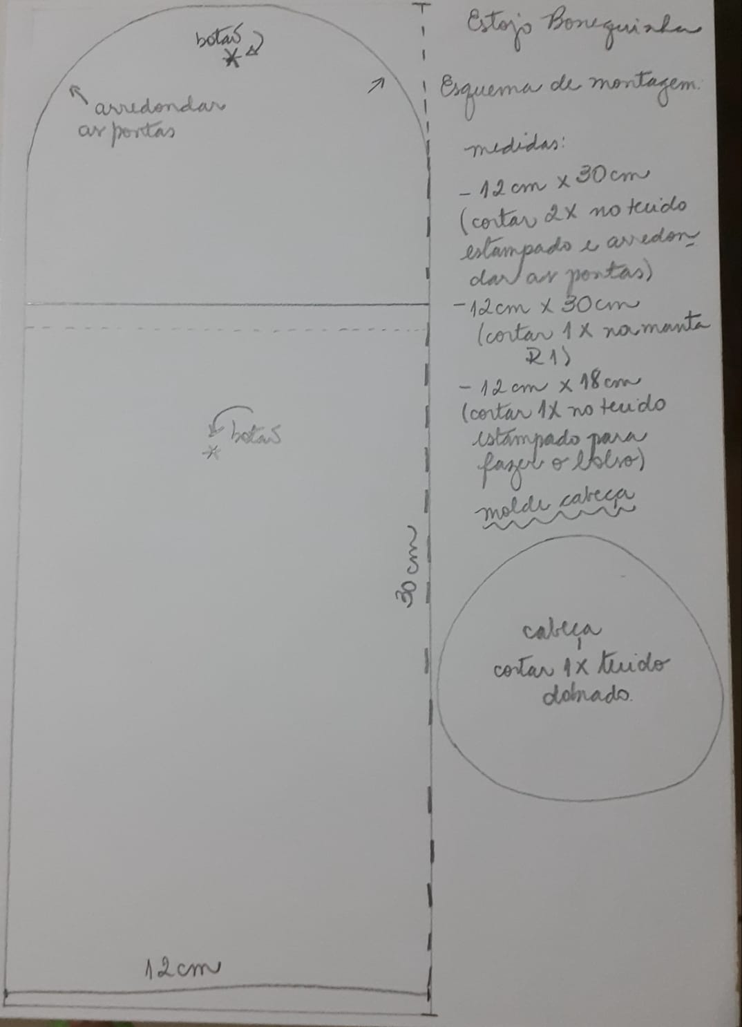 Para a bonequinha: risque o molde do rostinho no tecido pele de boneca, costure e encha firmemente.