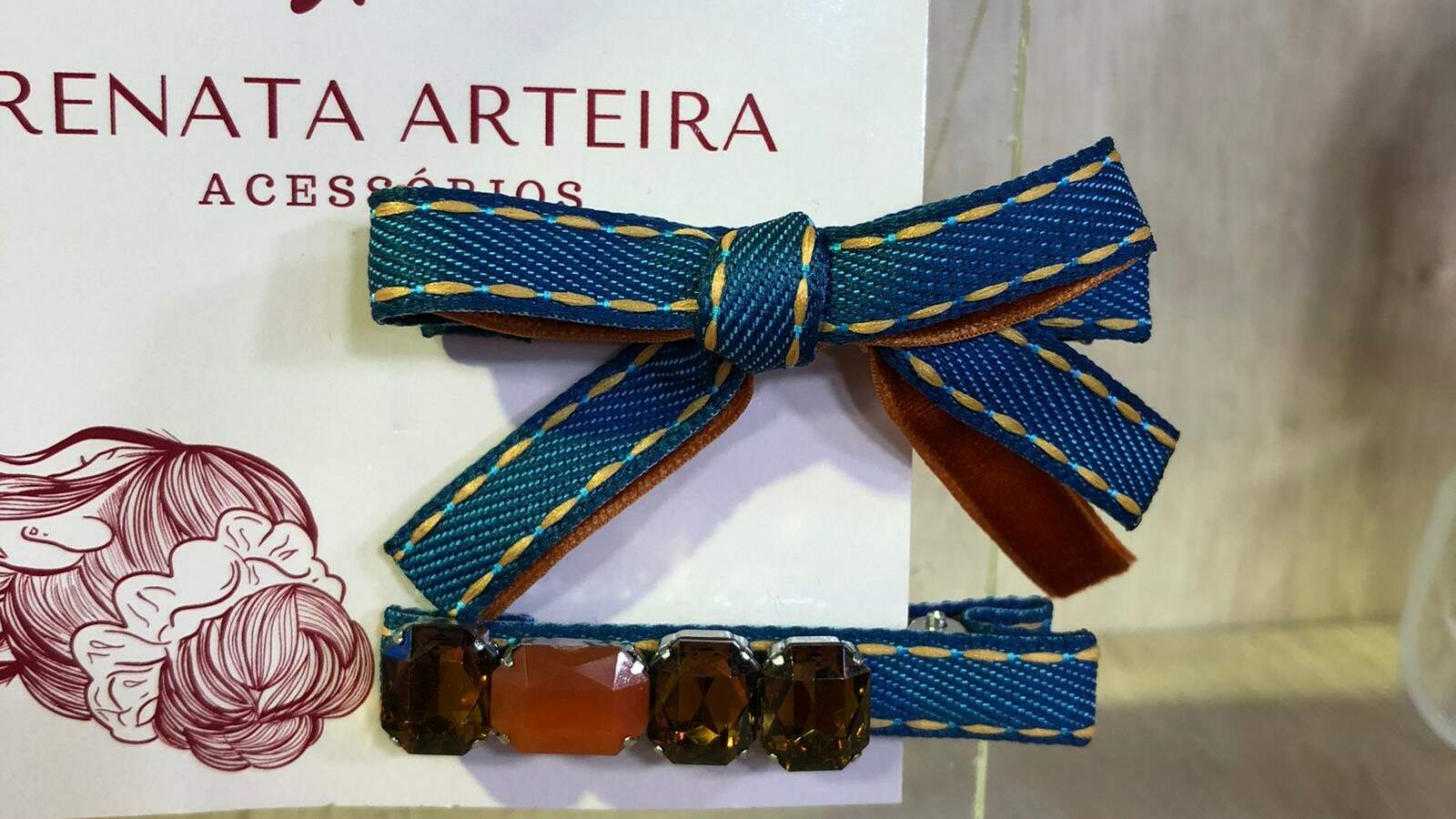Juntar a fita de veludo com o jeans e produzir o lacinho no tear de laços, em seguida colar ele no bico de pato já forrado.