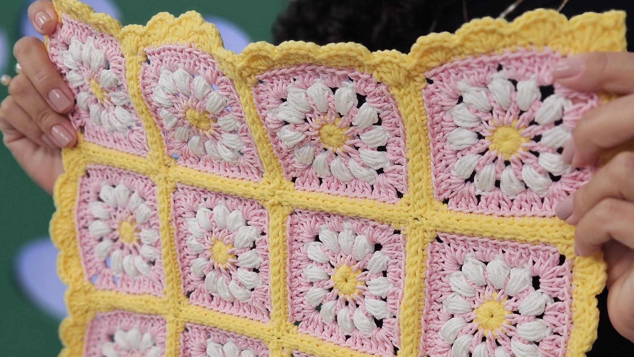 Junção: Costure os quadrados com auxílio de uma agulha de tapeceiro e fio da mesma cor da carreira de 5. No momento da costura pegue apenas a alça traseira. Faça a união de 3 em 3 e depois faça a união de cada coluna, formando assim o retângulo com 12 quadrados.