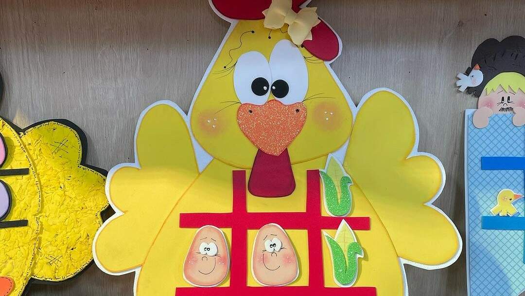 Para fazer a parte do jogo utilize o estilete ou a tesoura para que fique perfeito, depois cole no centro da galinha; e