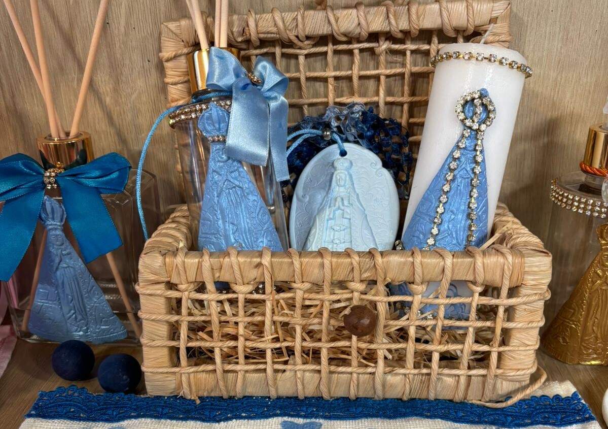 Colocar no molde de silicone de Nossa Senhora, a tinta renda azul. Aguardar secagem por 4 horas. Retirar e colar no frasco do aromatizador. Na tolha de lavabo, colocar o stencil e pintar com a ajuda do pincel de tecido usando a tinta para tecido azul.