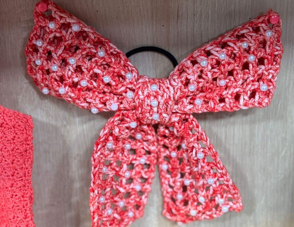 A parte faça 7 corr.1 pt. alto na 4ª corr. e trabalhe em pts altos, por 6 carr. e arremate. Costura no centro do laço.