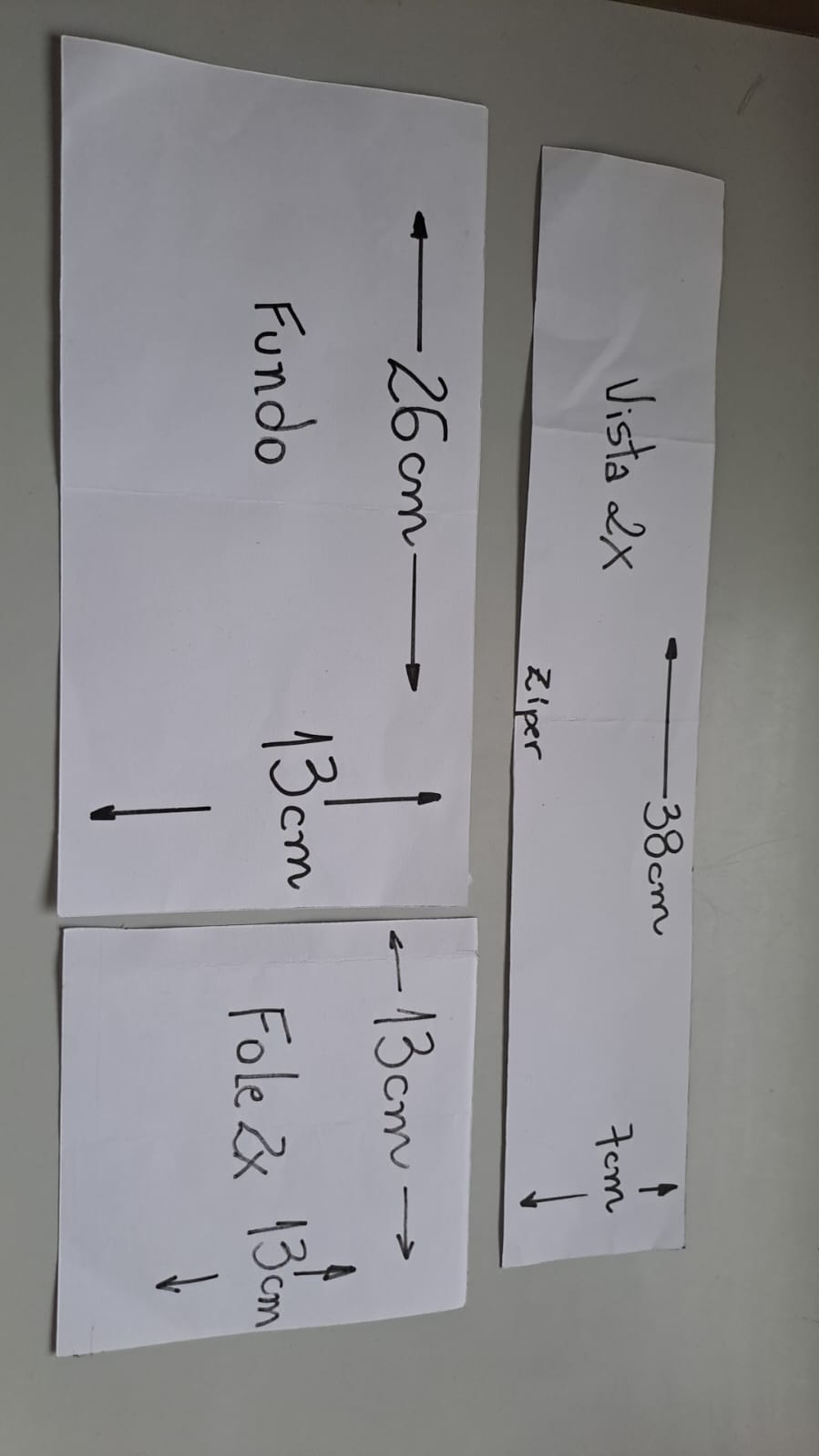 Para o fole, recortar 2x 38 cm x 7cm o tricoline, dublado e o forro.