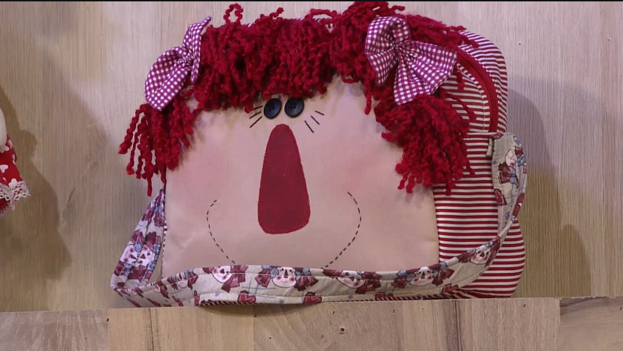 Decorar com 2 laços e lã vermelha com 20cm x 12cm.