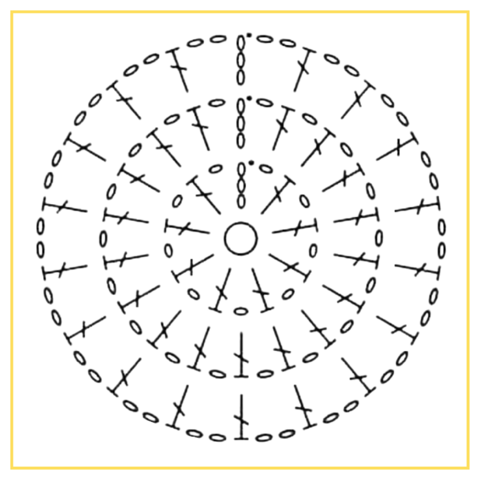 3ª carreira: suba 3 correntinhas, trabalha igual a carreira anterior, mas com 2 correntinhas de intervalo entre cada ponto alto, até o final da carreira;
