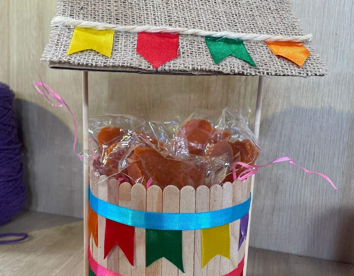 Dobre o papelão no meio para fazer o telhado e no lado interno da dobra, cole um palito de churrasco com cola quente. Depois é só unir o telhado aos pilares também com cola quente e encher a sua mini barraquinha com muitos doces juninos.