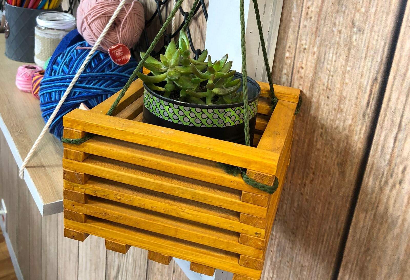 - Agora é só amarrar as pontas dos cordões nas laterais do cachepô.