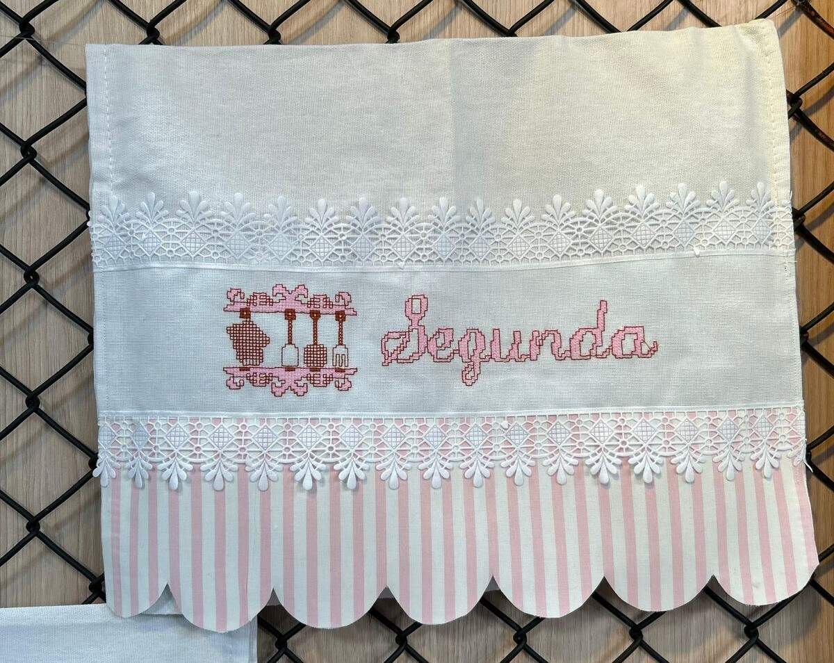 Com a Máquina de Costura no ponto reto, costurar toda a faixa bordada em Ponto Cruz com o dia da semana. Já costurar junto o guipir Branco dando o acabamento.