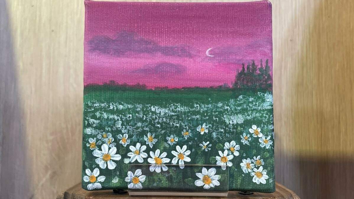 - Segunda demão de tinta: nuvens, árvores e fundo de margaridas.
