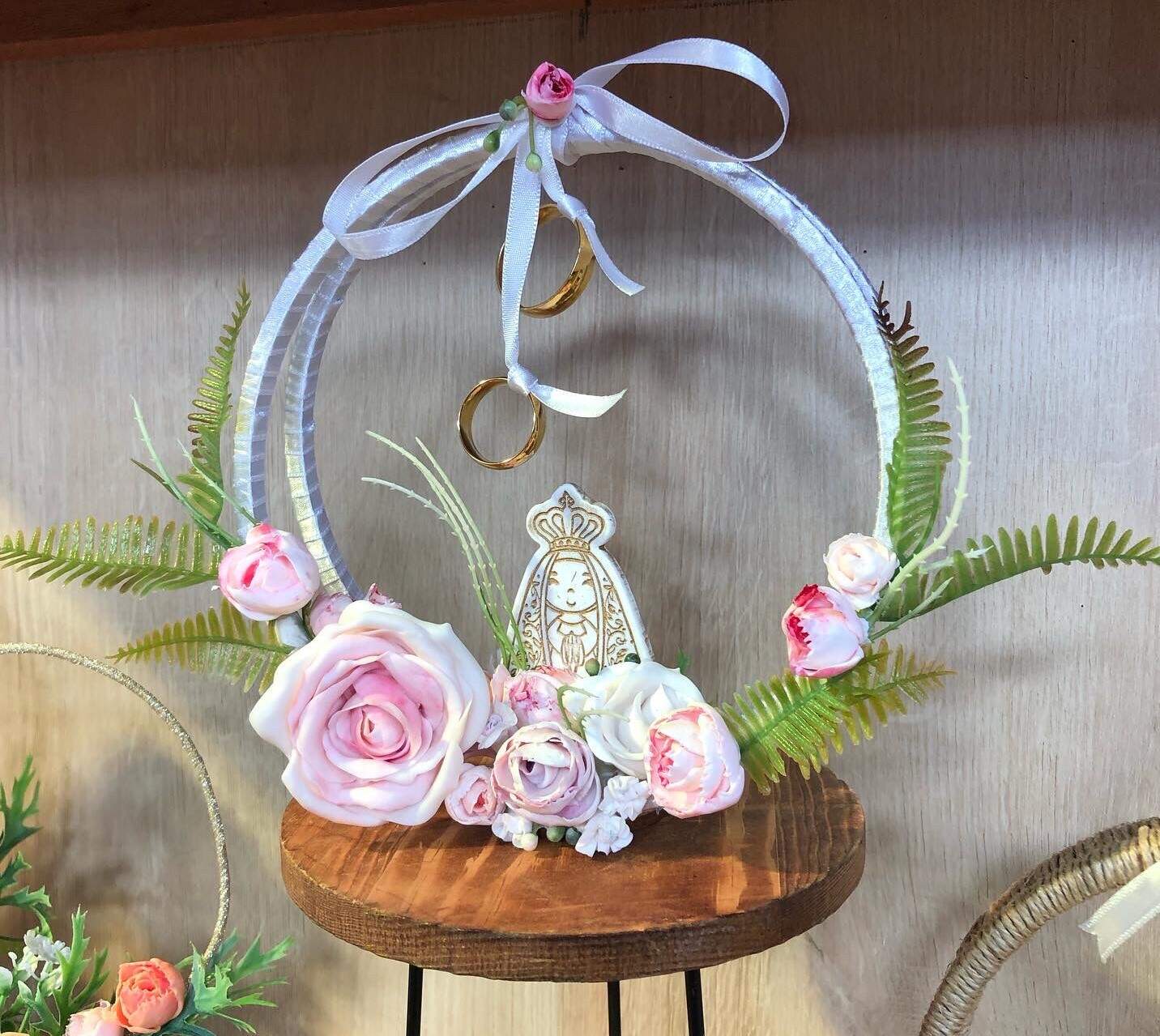 -Na parte superior, envolver com fita de cetim, finalizando com um laço e flor, deixando um pedaço de fita para amarrar as alianças.