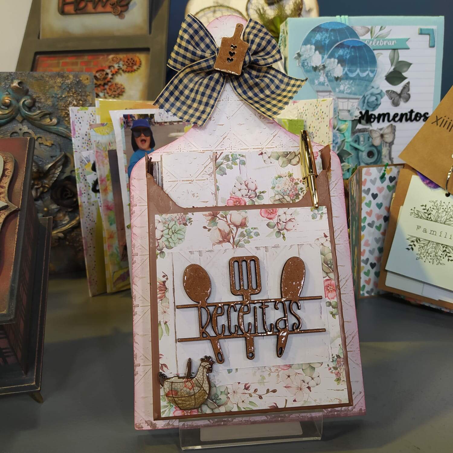 Furar todos os papéis juntos, usando o agulhão sobre a base de EVA e unir com o cordão encerado, fazendo um laço no lado de fora do caderno e finalizar com um aplique acrílico.