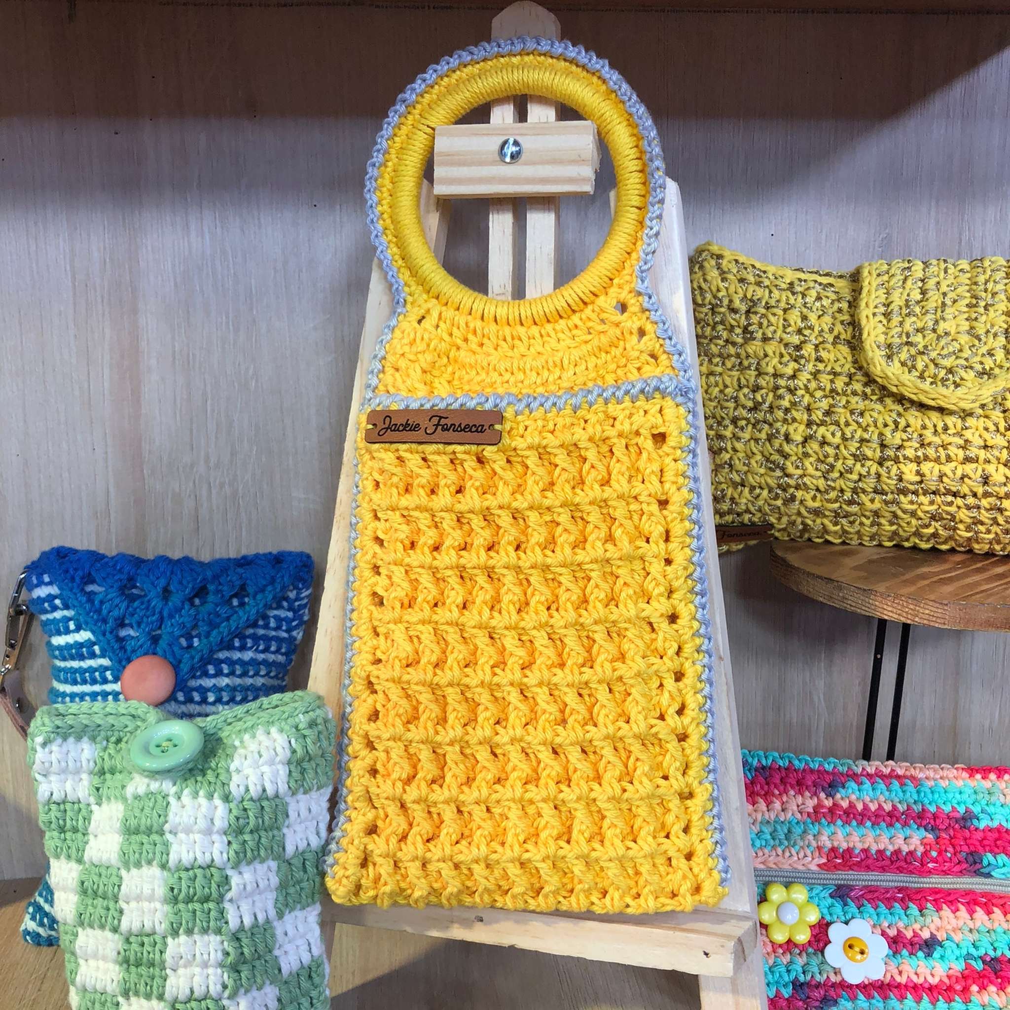 Agora dobra a peça até terceira carreira abaixo da Argola. Com a outra cor e com ponto sianinha, faz o acabamento, fechando as laterais e contornando a volta toda da peça com essa segunda cor. Arremata e pronto!