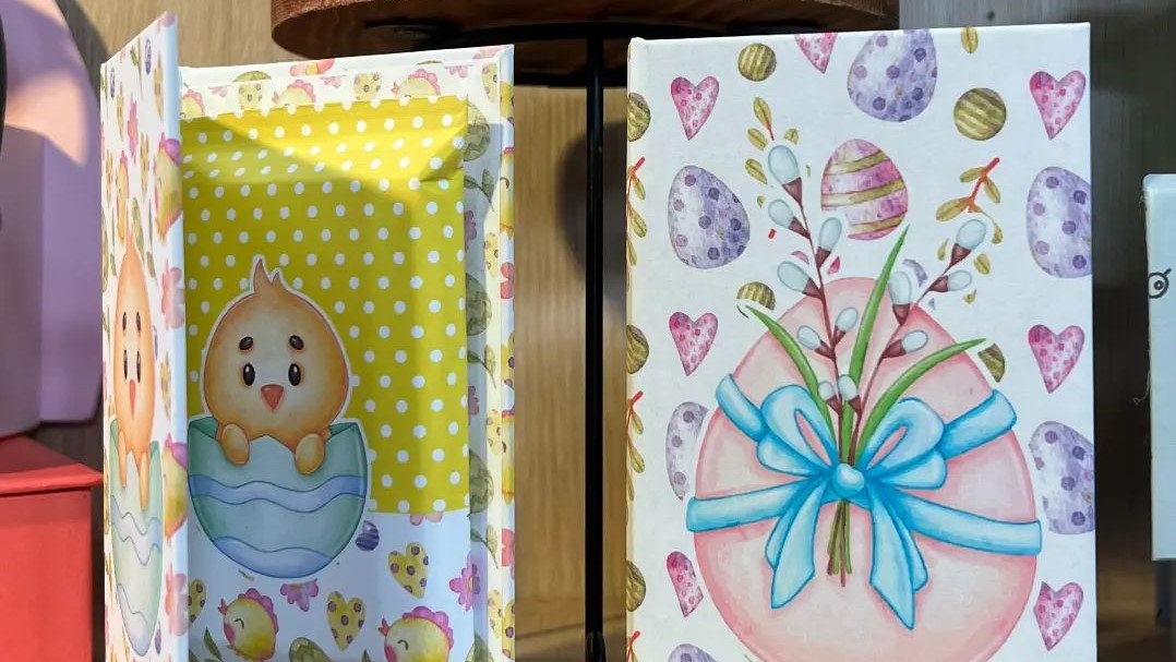 Com fita Dupla face nas extremidades, posicionar o chocolate no meio da arte, e fechar para acabamento de embalagem.