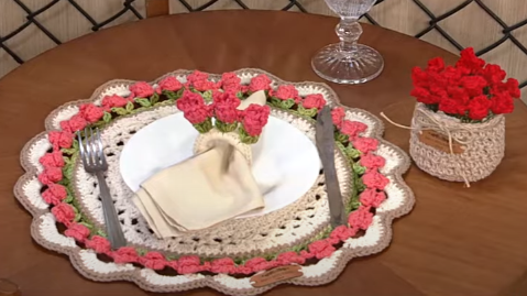 3 - Troca de fio para tulipas: Com o fio vermelho, faça um ponto baixo e uma correntinha (simulando o ponto alto) dentro do primeiro leque, faça mais 4 pontos altos no mesmo espaço, ficando com 5 pontos altos, solte a agulha do ponto, entre na correntinha do primeiro ponto alto e puxe a laçada do ponto alto que você soltou, passe por dentro da correntinha, formando um ponto pipoca, faça 3 correntinha, e dentro do buraquinho que se formou faça um ponto baixo, repita mais três correntinha e um ponto baixo no mesmo espaço, faça novamente 3 correntinha e um ponto baixo no mesmo espaço, fizemos a primeira tulipa, repita este processo por mais 2 vezes dentro de cada leque, corte o fio e faça o arremate.