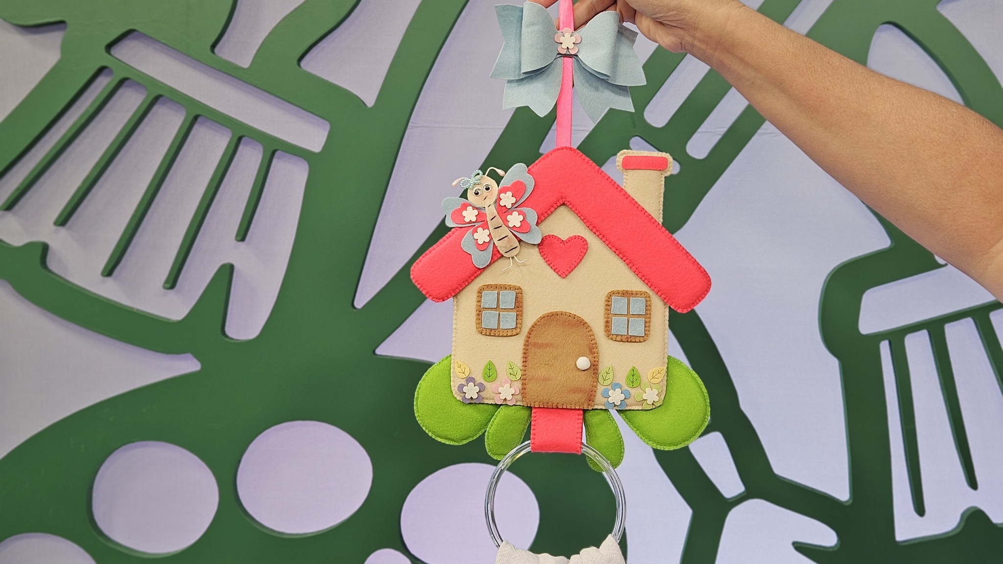 Monte a base da casinha fazendo o “sanduíche” (frente, enchimento e verso), colando ou caseando toda a volta.