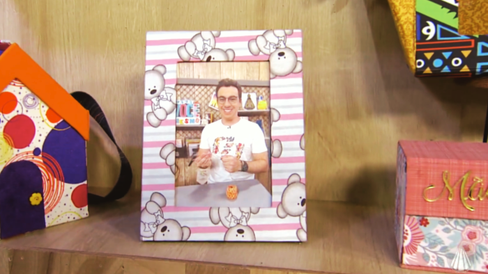 24 - Finalize colando a parte 1 (com o vazado e a compensação) atrás do porta-retrato já montado, usando cola branca ou cola instantânea.