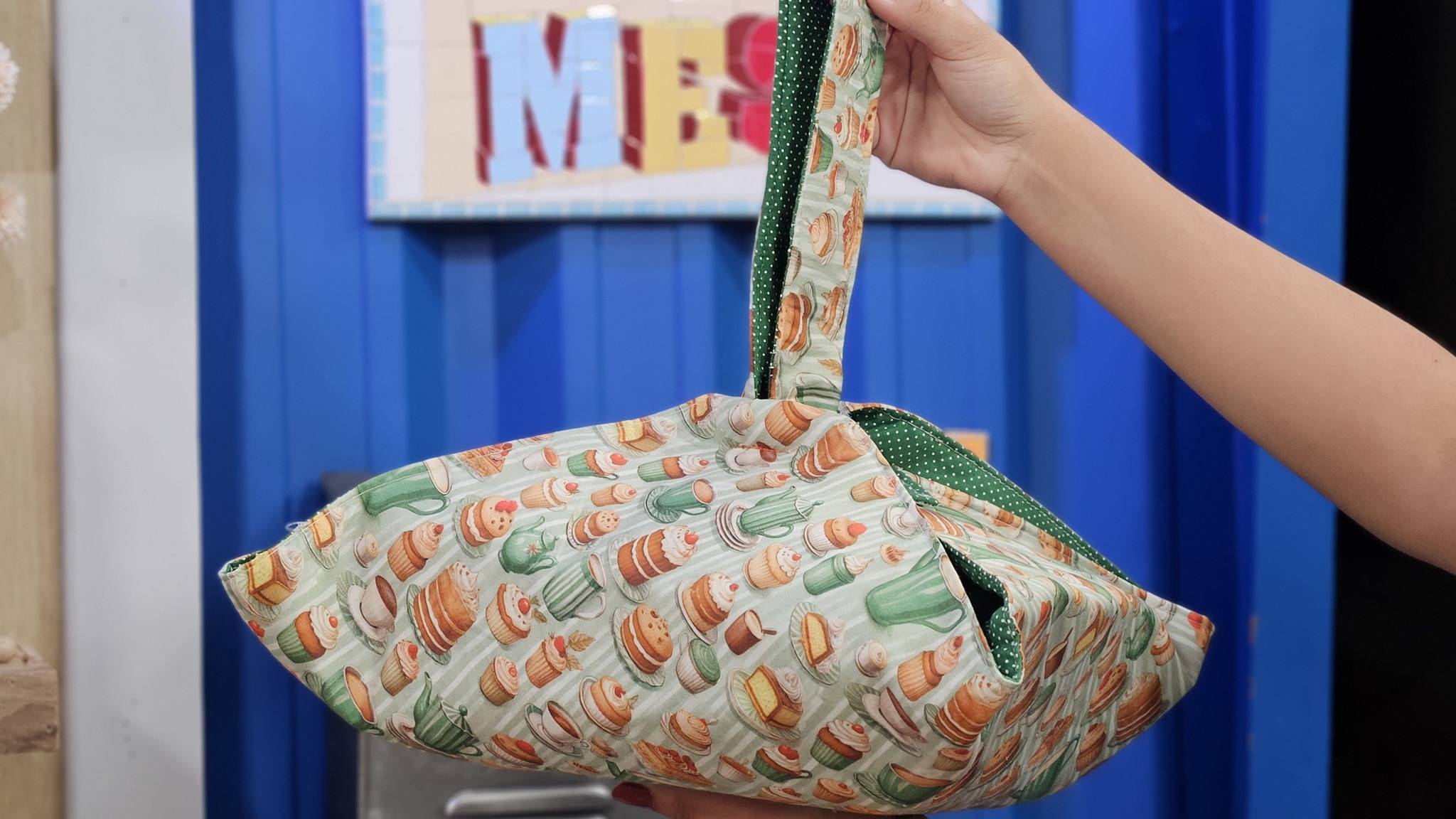Pegue a peça principal, dobre ao meio formando um triângulo e marque. Posicione a alça na peça e costure as extremidades. Por fim, pregue as argolas nas outras duas pontas