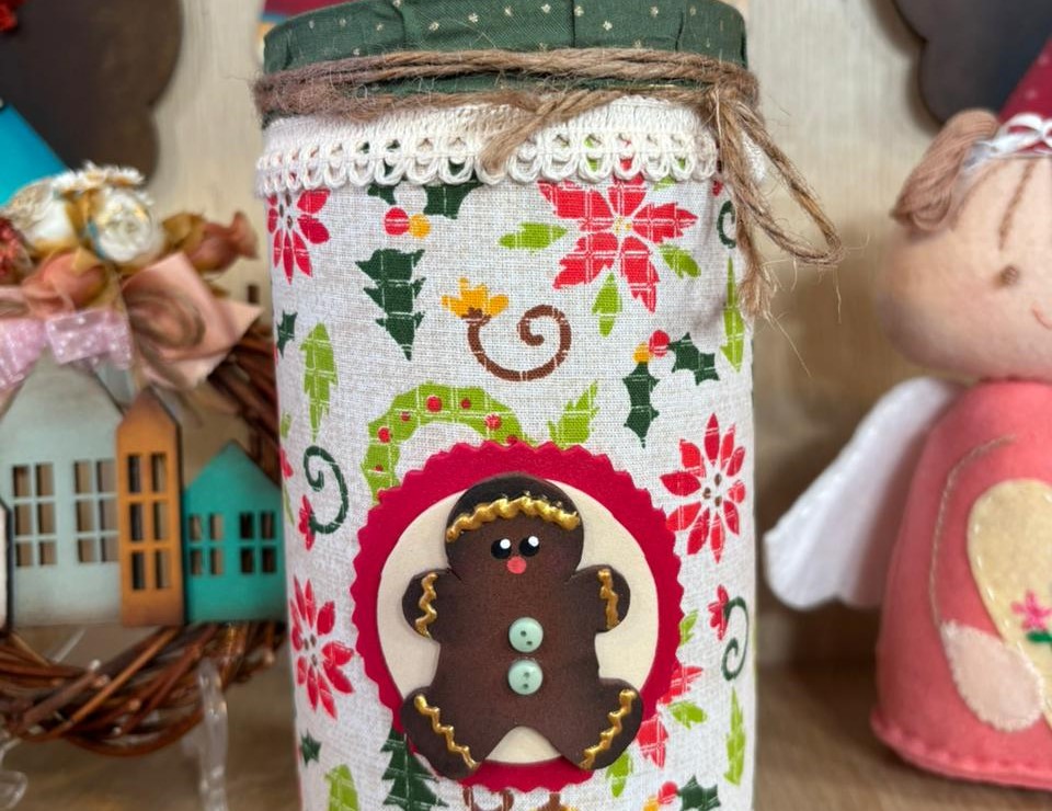 Use outro tecido para forrar a tampa do pote e faça o acabamento com fio de sisal.