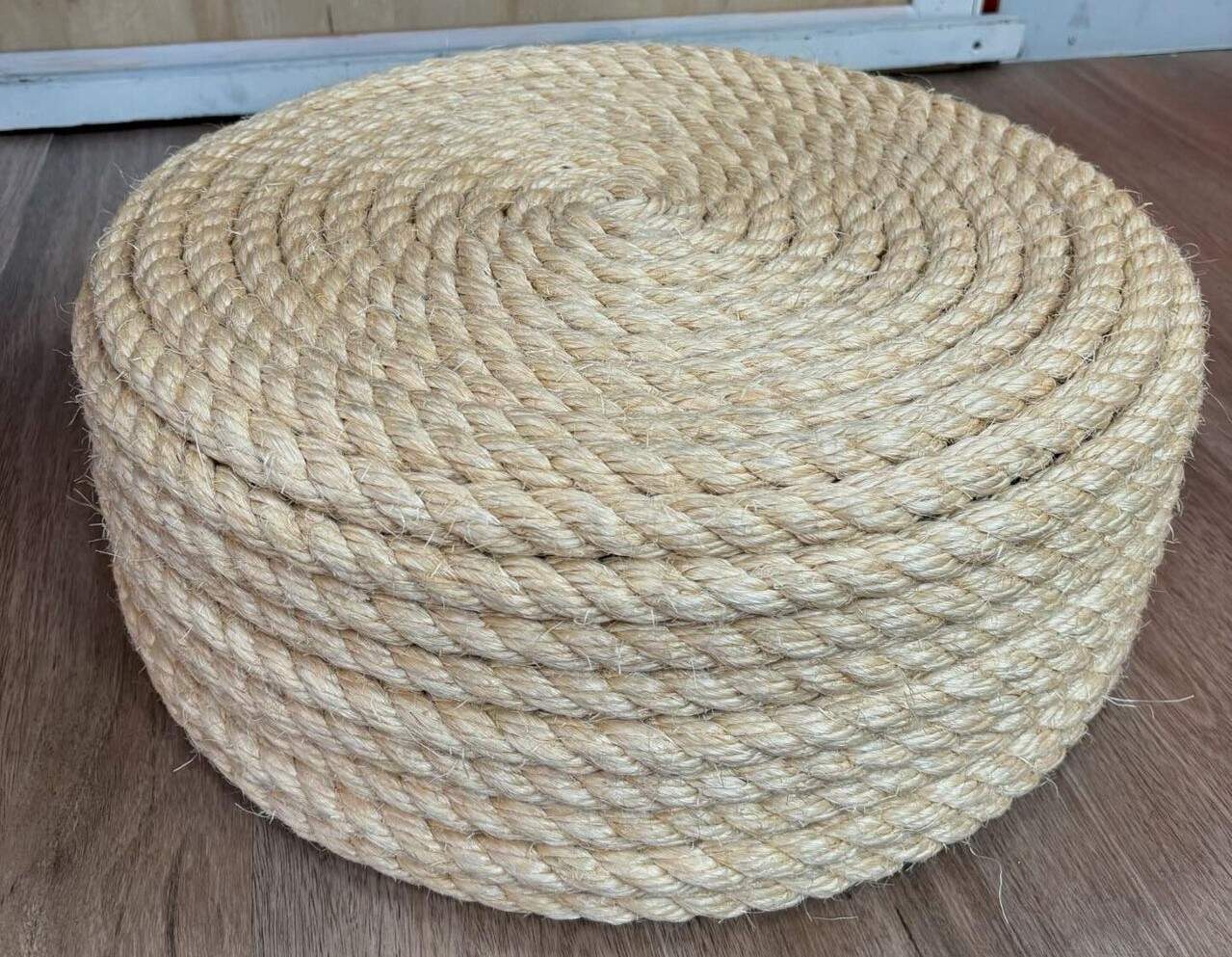Faça um corte em diagonal na ponta da corda de sisal e comece a colar no pufe com a cola quente, em forma de caracol, do centro para as laterais.