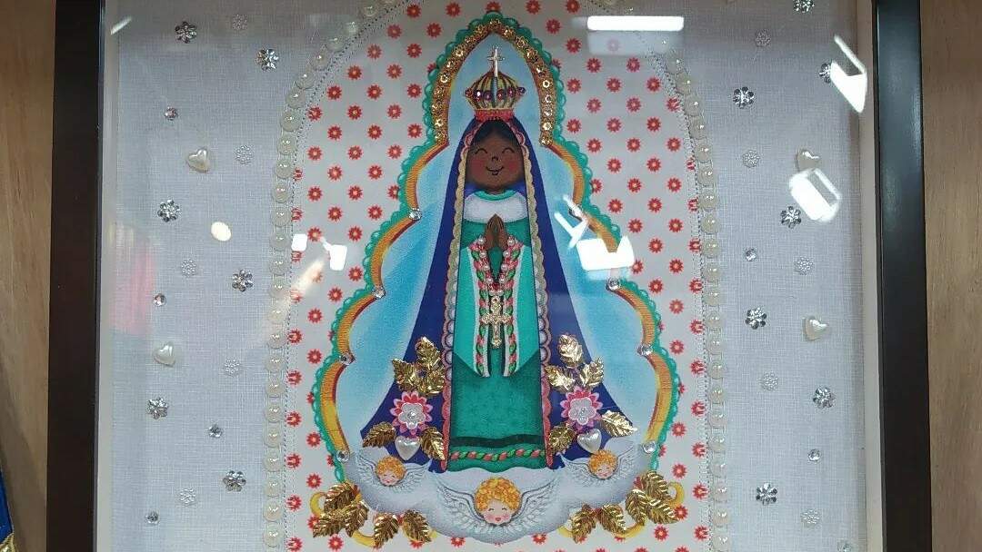 Colar o termocolante com o ferro na parte de trás do tecido com a imagem de Nossa Senhora Aparecida e recortar na linha pontilhada.