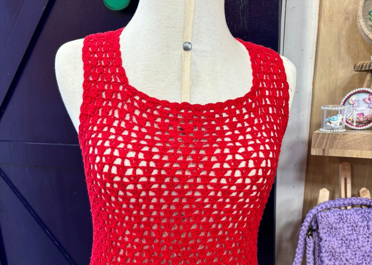 Com ag. de tapeçaria costure os ombros, faça um acabamento contornando as cavas e decote, com 3 corr, 1 pt. alto no mesmo espaço, pula 2 corr. 1 pt. baixo, e repita.