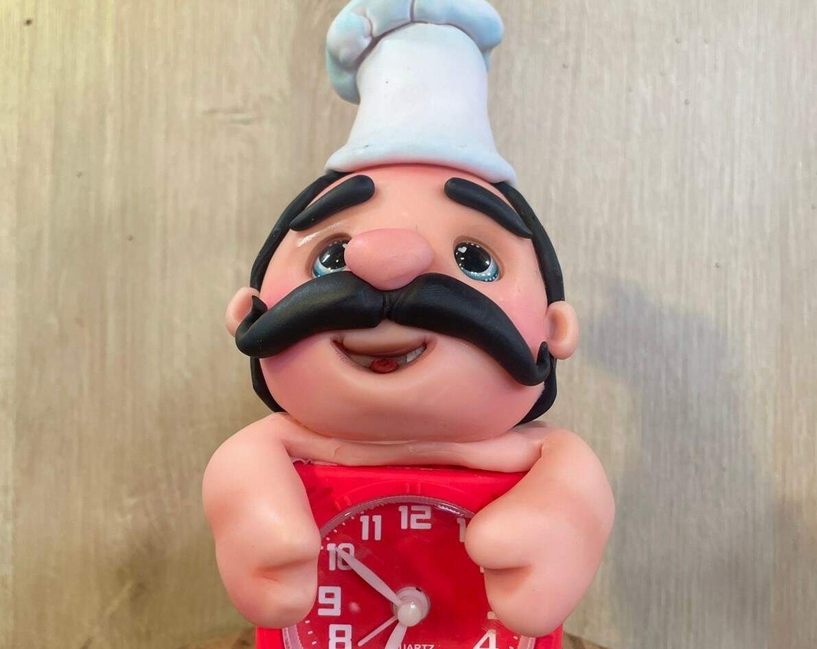 Chapéu: com um pedaço de papel alumínio faça um cubo e cubra ele com fita crepe, abra a massa branca e cubra esse cubo unindo as laterais. Com 20 g da mesma massa abra um círculo e faça o formato de fuxico fechando as bordas e colando para baixo acima do cubo. Cole acima da cabeça do cozinheiro. Faça duas coxinhas alongadas para a sobrancelha e cole acima dos olhos.
