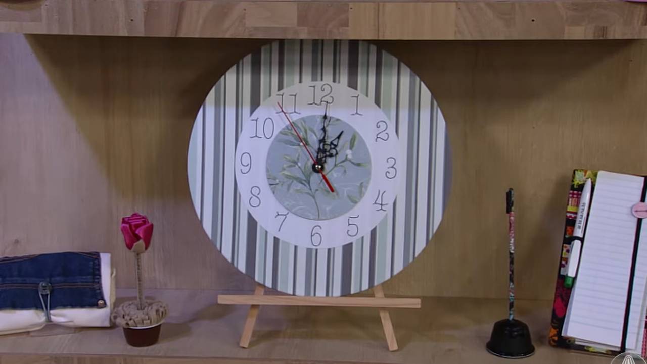 Separe um CD, pinte com a tinta branca, aplique a cola e fixe o guardanapo de papel, deixe secar e retire as rebarbas com a lixa de unha e cole no centro do relógio em cima do papel fotográfico; e