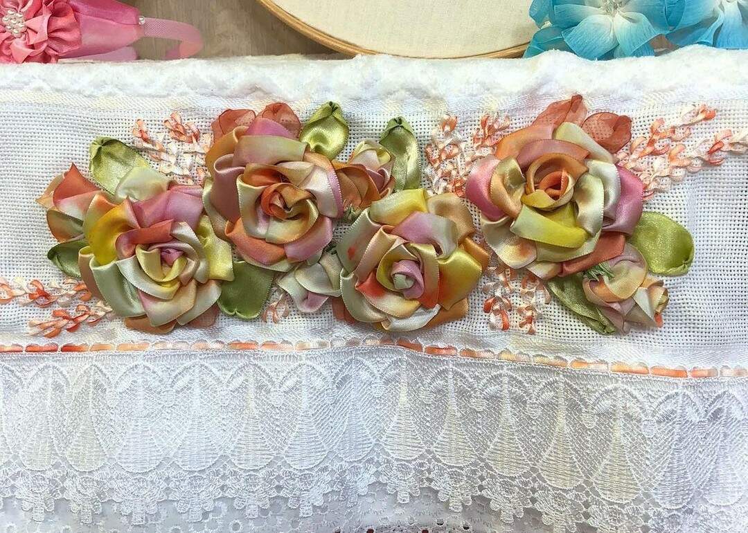 Pegue a fita de cetim nº 5, dobre em forma de triângulo e alinhave na parte debaixo. Repita 13 vezes esse procedimento que formará 13 pétalas, depois franza e enrole para fechar a flor e costure embaixo. Para os arabescos, usamos ponto pena e, na folha, o ponto japonês.