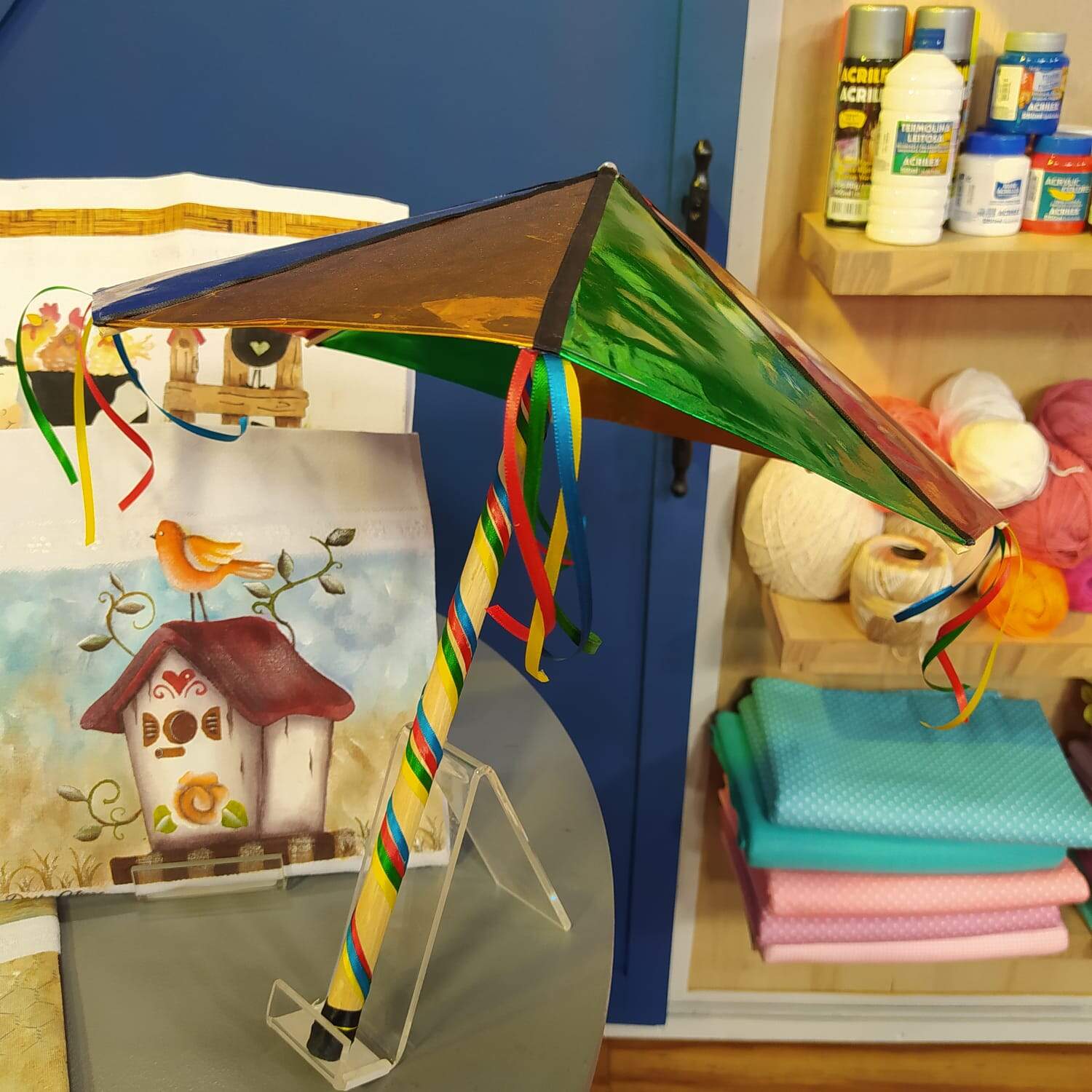 Com as fitas de cetin coloridas faça uma decoração no cabo da sombrinha e com a cola quente cole ela no centro da sombrinha.