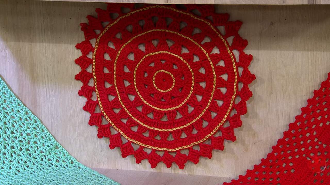 Faça as correntes nas carreiras de pontos altos bordando com a mesma agulha e com o fio encanto. Prontinho!
