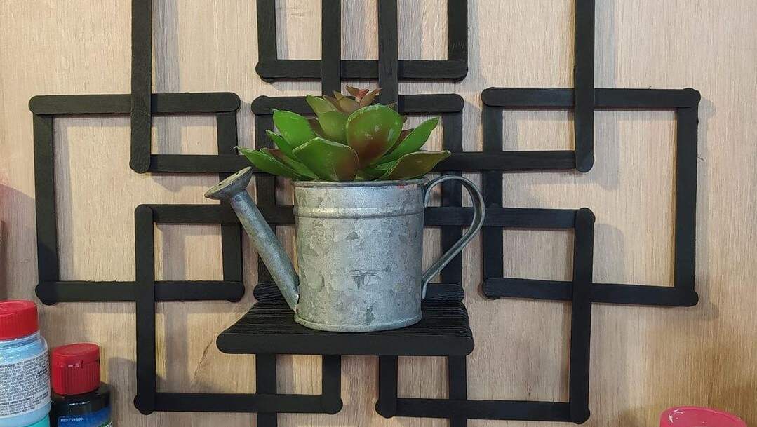- cole 35 palitos um sobre o outro para criar uma pequena prateleira e cole no centro do suporte;