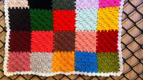 3 - Para o acabamento, fazer o contorno de 3 em 3 correntes a volta toda e nas pontas do tapete coloque 2 pontos baixos no mesmo lugar, suba 3 correntes e faça mais 3 pontos altos fazendo um bloquinho de pontos;