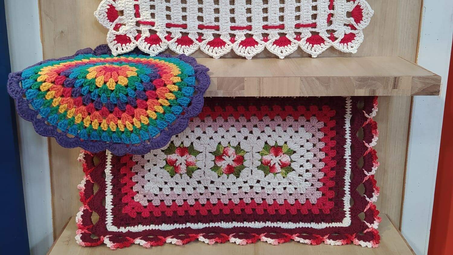 Para o 8° bloco de 3 pontos vamos fazer o seguinte: 2 pontos no mesmo espaço e 1 ponto no próximo ponto de base, sendo assim ficará um total dos 8 grupos, agora passe para a lateral fazendo somente 3 pontos altos e 2 correntes pulando um grupo de pontos na base, complete toda a volta lembrando de fazer a msm modificação na outra parte do tapete também. Finalize com ponto baixíssimo e arremate o fio.