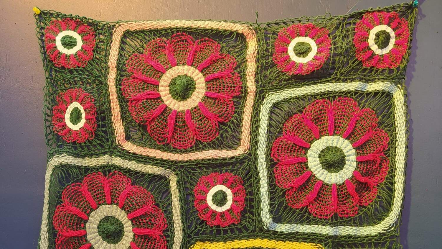 Com fio vermelho tramar passando fio a fio, um por baixo outro por cima, utilizando o fio verde reservado para alternar a trama, o que estava por baixo na próxima carreira estará por cima, assim faremos 5 voltas, quando passar pelo fio reservado iniciando a 6º volta, continuar com o fio a fio, ao chegar no par sem nó, levar o fio até a volta dada com fio verde, passar por baixo e voltar laçando o fio e continuar a trama até o 3º par de fio sem nó, assim por diante completando 6 voltar laçando o fio, depois sumir com a ponta do fio vermelho pela trama.