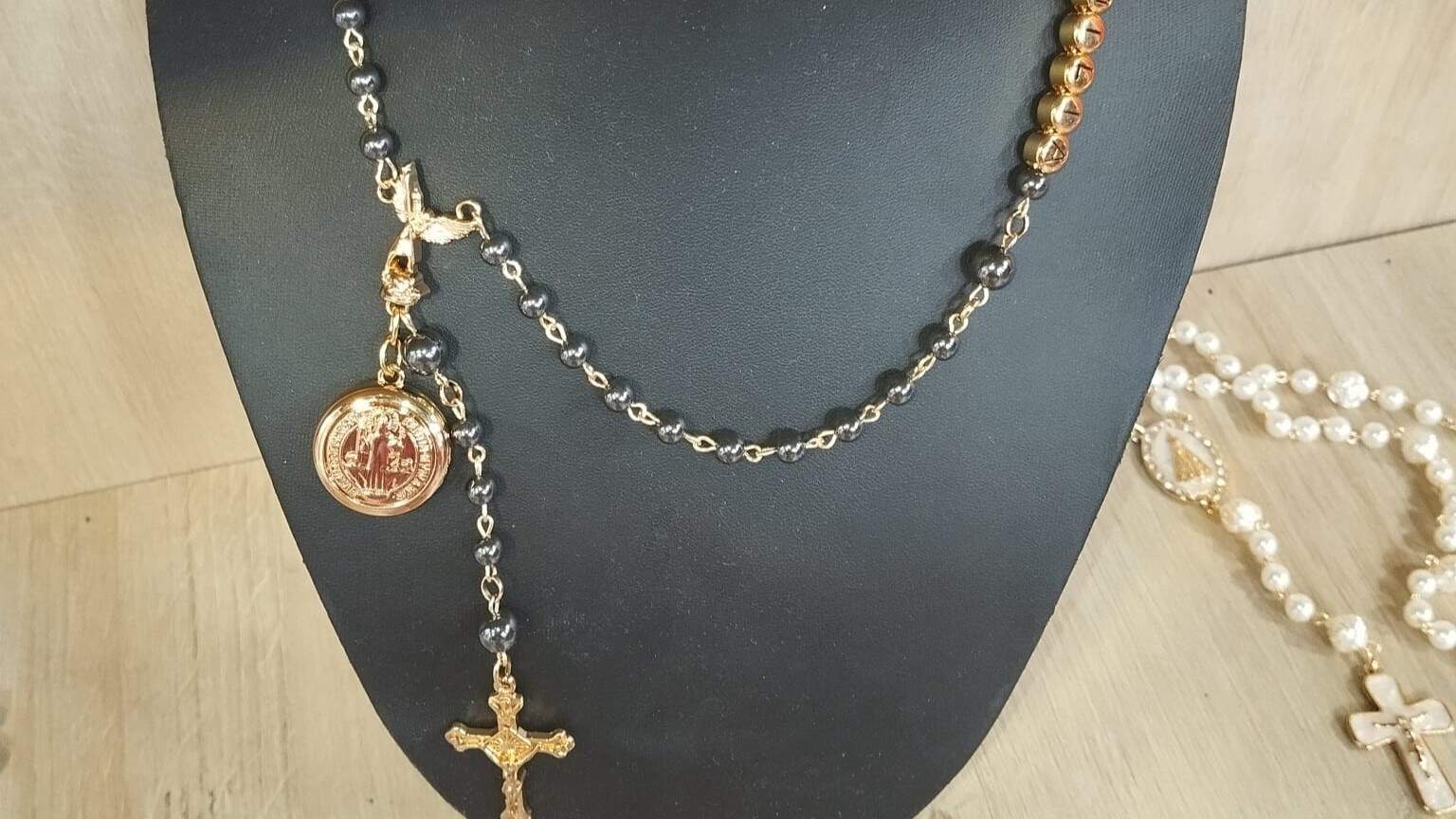 Para o Pai-Nosso fazer o mesmo processo, porém encaixar a cruz de hematita, continuar o mesmo processo até finalizar todos os mistérios;
