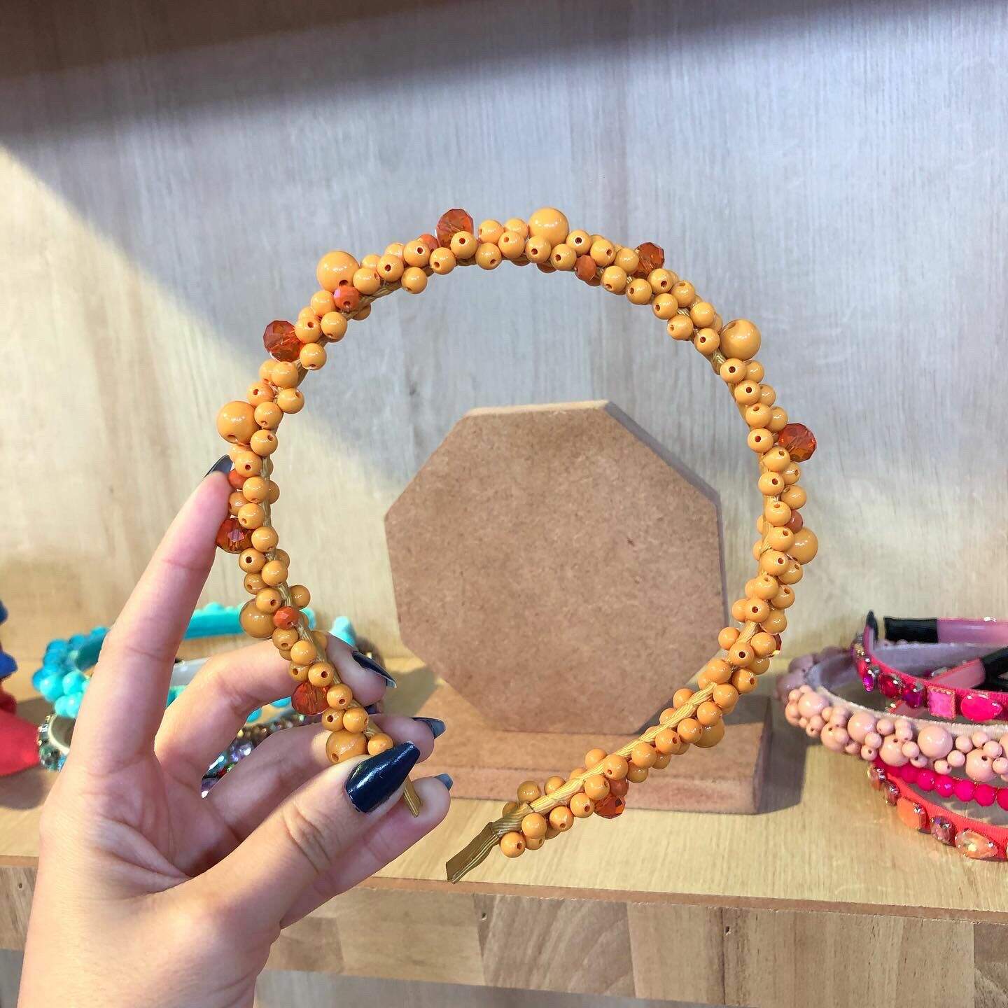 Feito isso vamos começar a bordar com a linha de nylon e agulha, colocando pérola por pérola e bordando uma de cada vez. Borde em partes. O processo de colocação das pérolas é aleatório, você vai analisando e produzindo. Dessa maneira cada tiara ficará de um jeito.