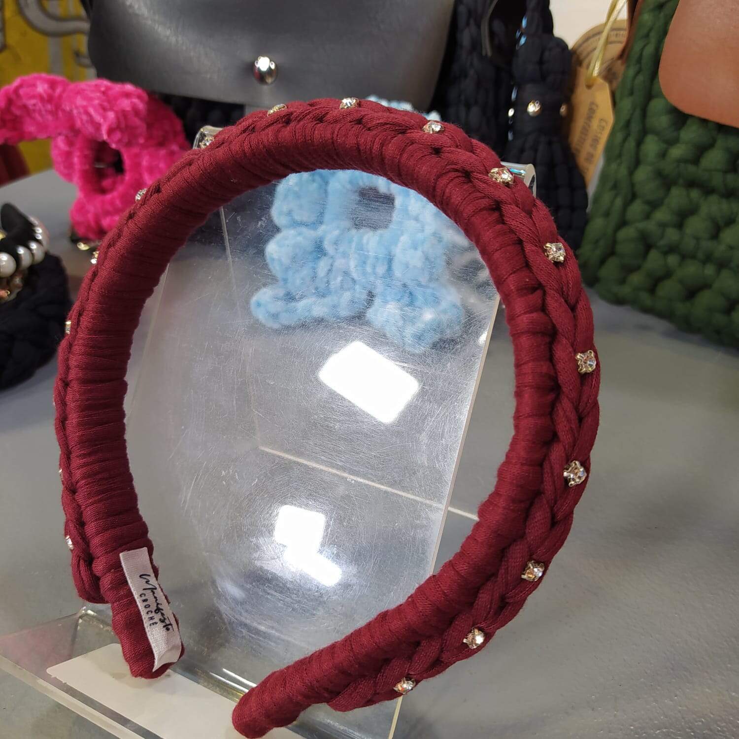 5: No último ponto puxe com a agulha o restante de linha. Então enrole a linha ao redor da tiara, com auxílio de cola quente, até o final.