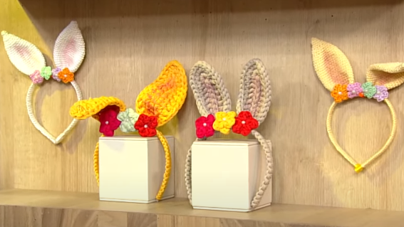17 - Use a cola quente para fixar as florzinhas nas orelhinhas de coelho, colando-as na parte de cima da tiara, conforme seu gosto;