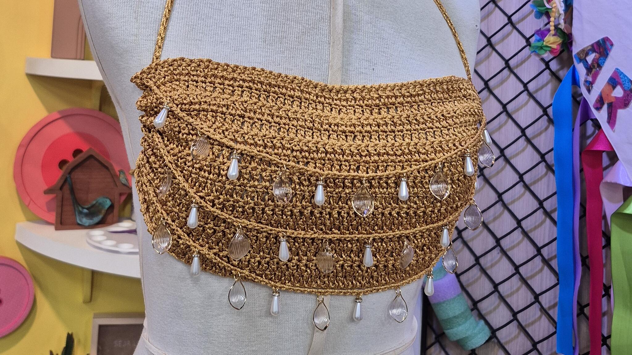 Para o acabamento da frente, fazer 3 fios de corr, com os pingentes e colocar na frente do top.