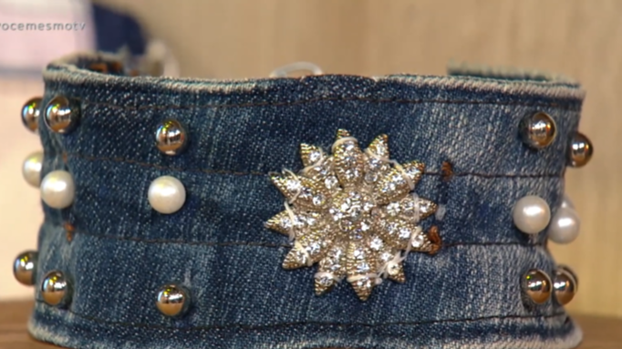 1 - Corte a tira de jeans, medindo no pulso o tamanho e acrescente mais 1 cm;