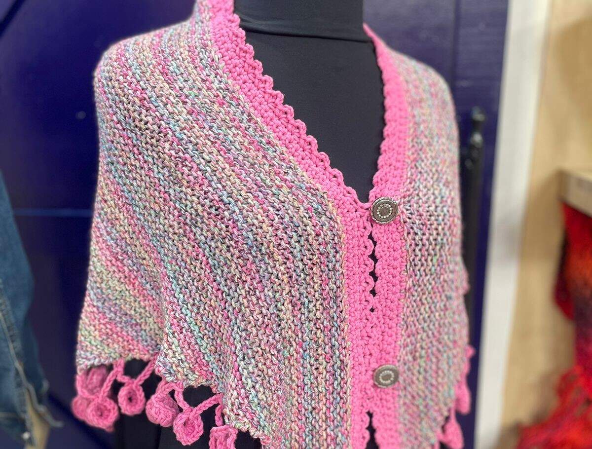 A seguir, com o fio Avelã e agulha de crochê n° 3½ passar no xale o acabamento em crochê explicado em vídeo aula.