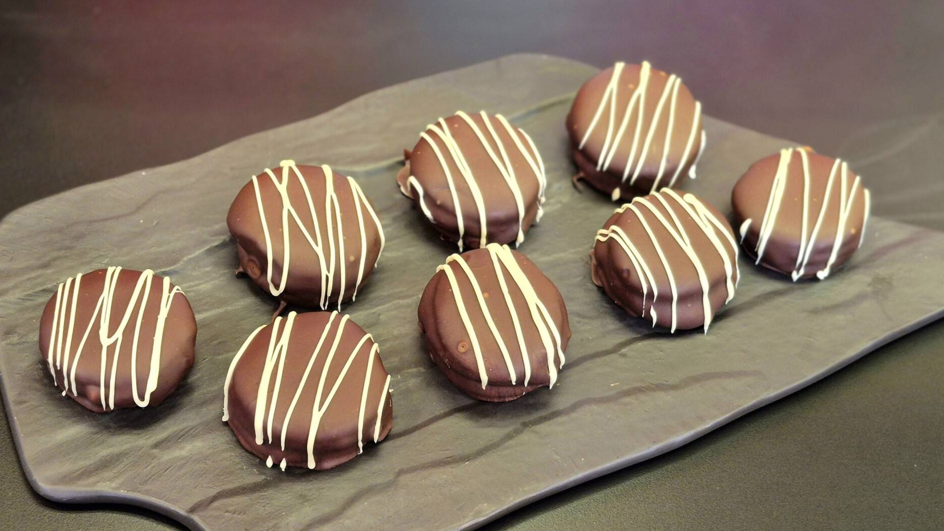 3- Cubra os alfajores com o chocolate derretido e decore com o chocolate branco.