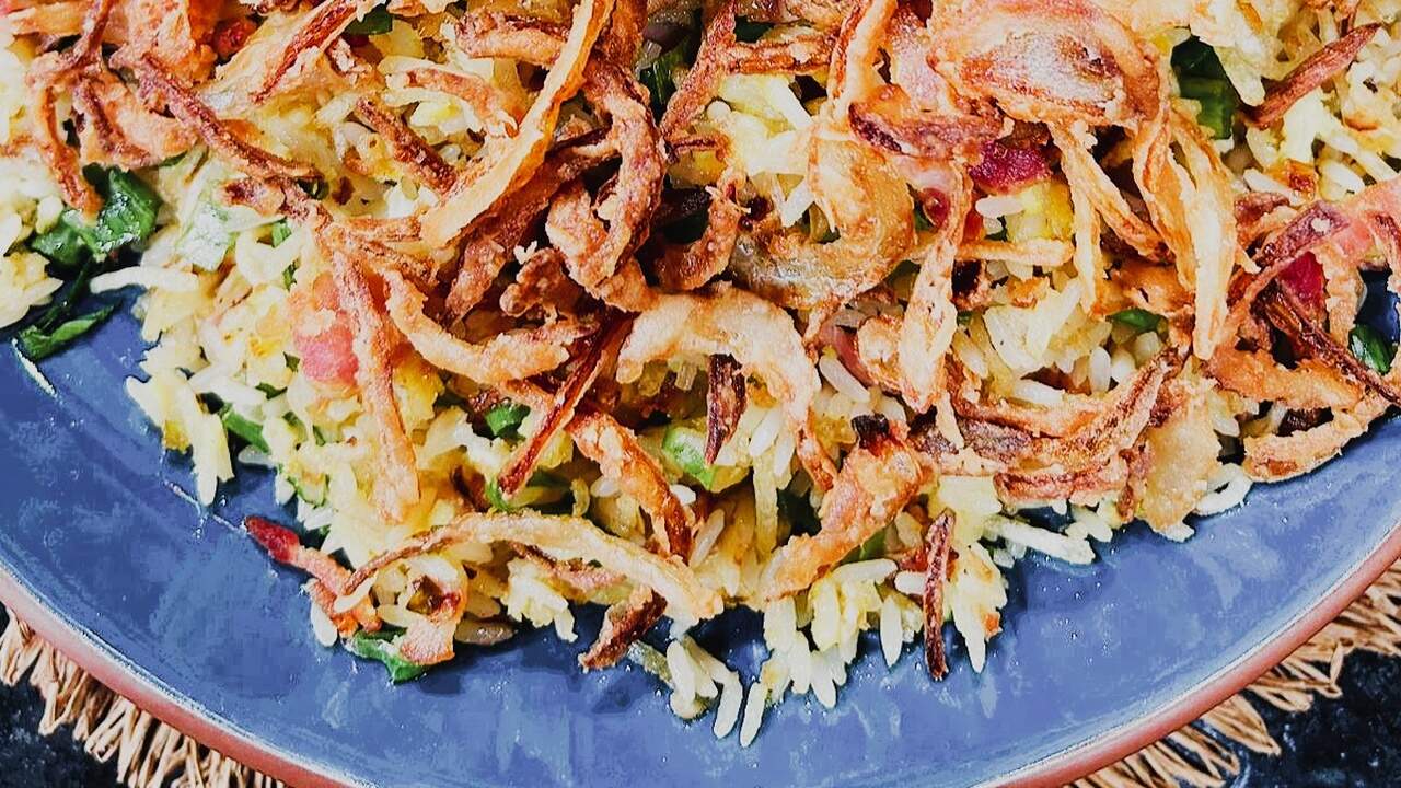 5. Desligue o fogo, finalize com a cebolinha, a batata palha e a cebola tirolesa.