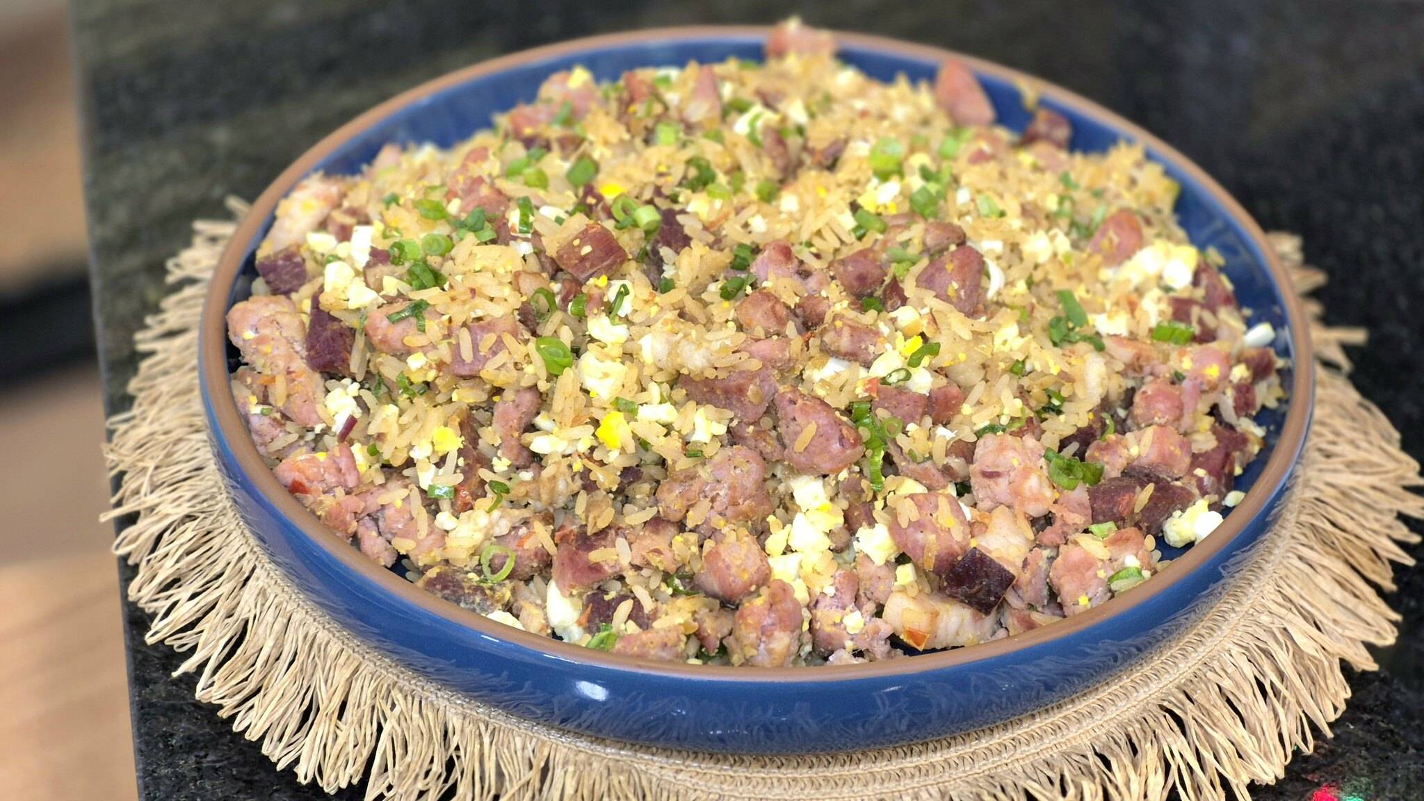 2- Acrescente a carne seca, o tomate e o arroz cozido. Refogue bem.