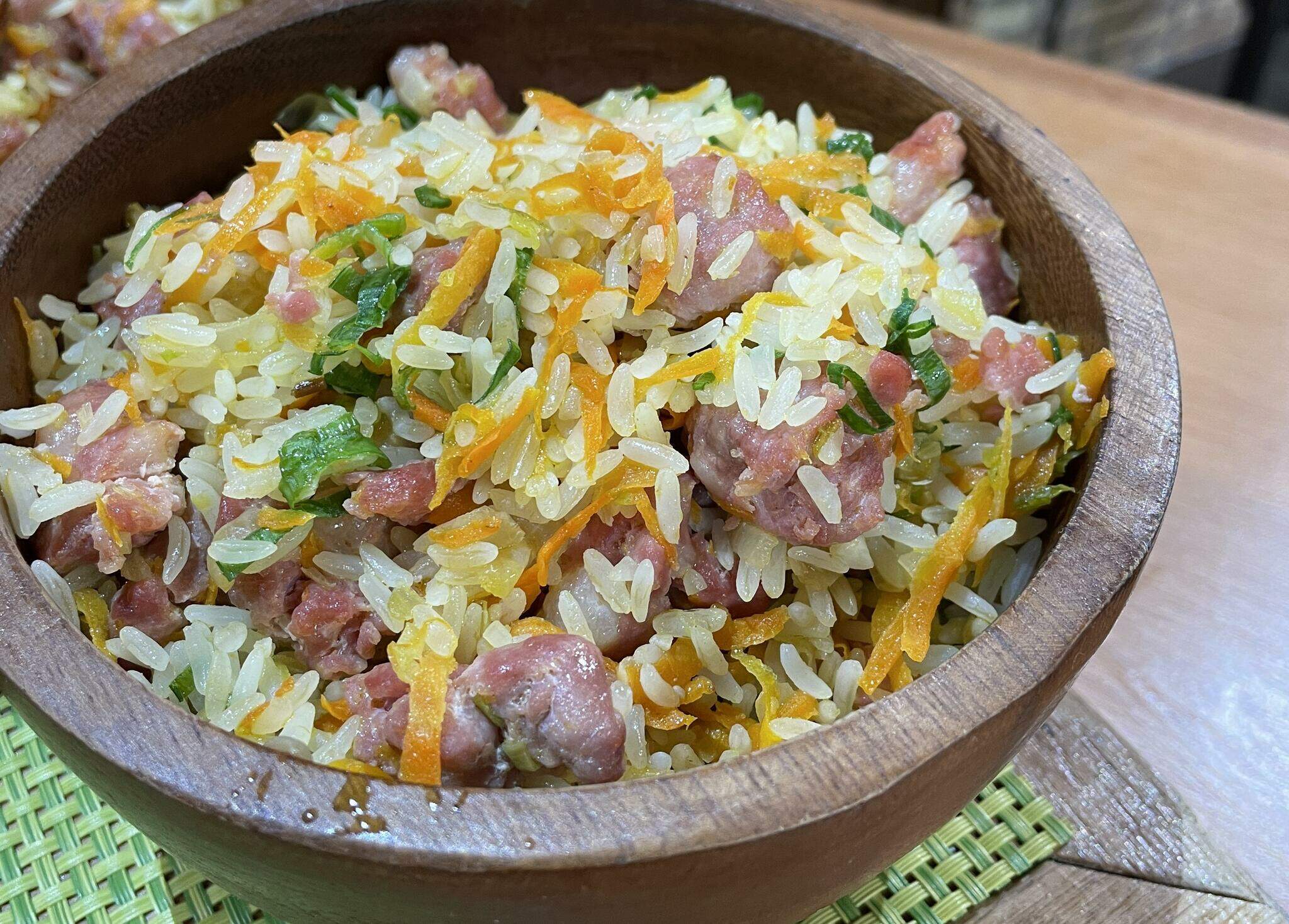 Adicione a cenoura e em seguida o arroz cozido, ajuste o sal e a pimenta.