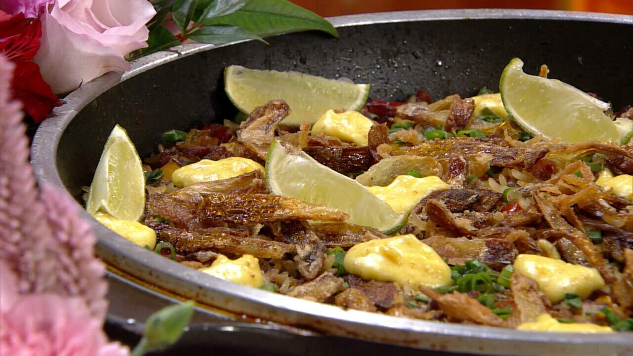 4. Finalize com cebolinha verde e maionese de alho-poró. Sirva.