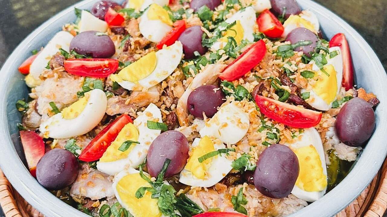 6. Retire e finalize com o alho frito, cebolinha verde e azeite.