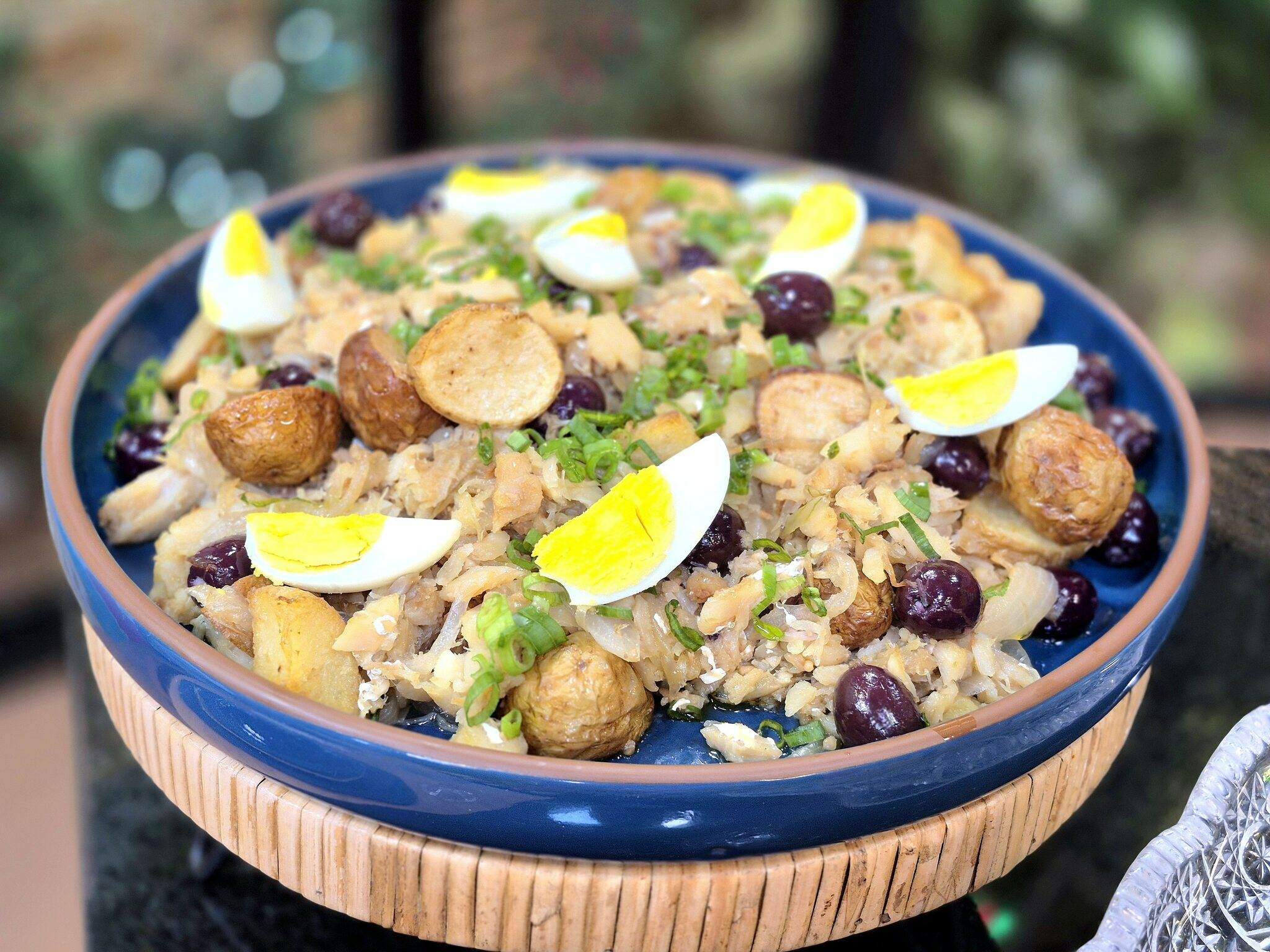 3. Coloque a azeitona preta, o bacalhau em lascas e deixe refogar rapidamente.